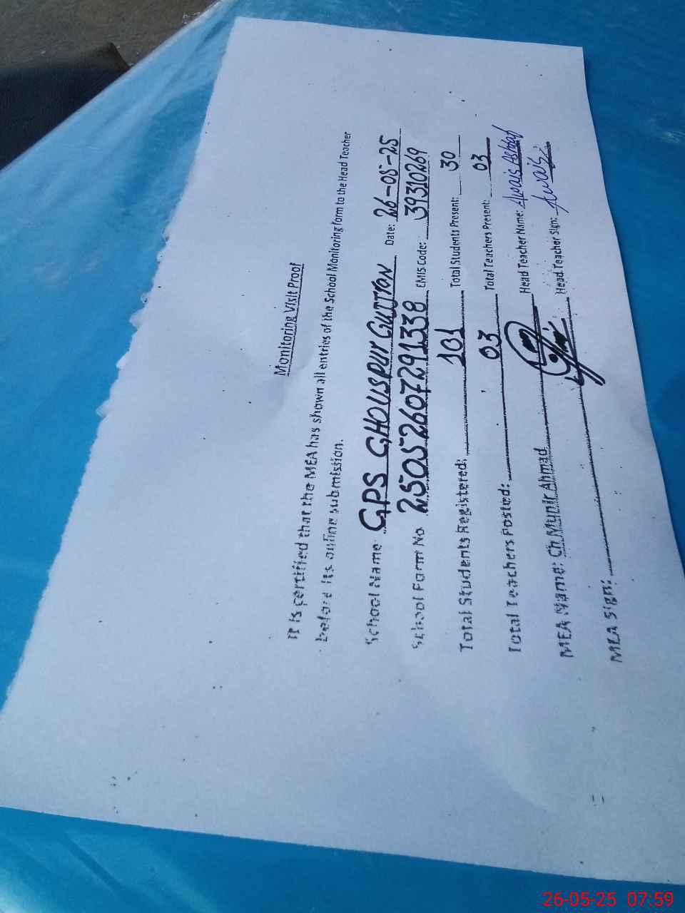 | EMIS Code: 39310269 | Name of School: GPS GHOUS PUR GUJJRAN (GHATTAY PHAKNI) | |||