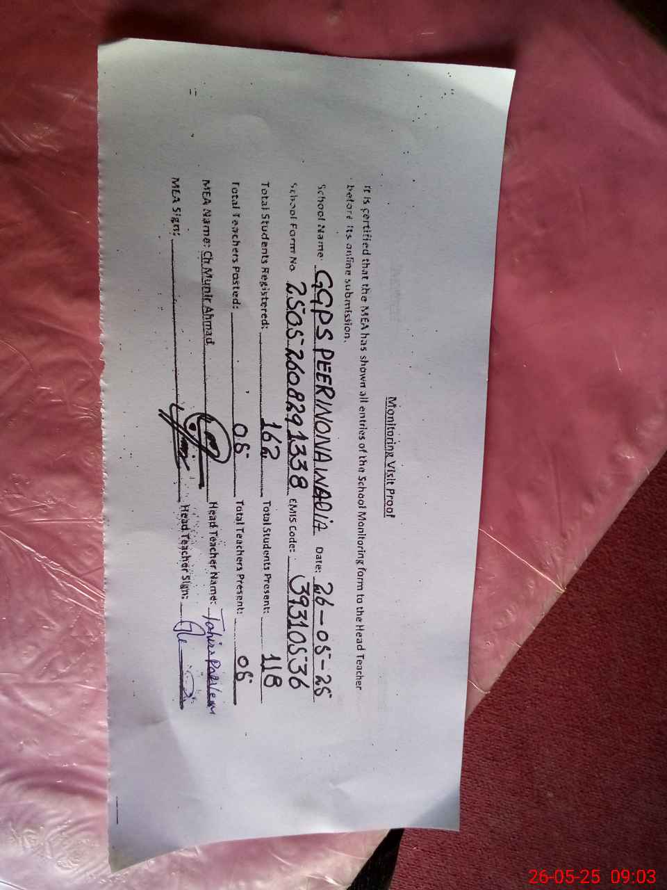 | Certified that this School was Inspected by the Undersigned MEA/DMO Today and the Information Stated Above is as Per Record. | |||||