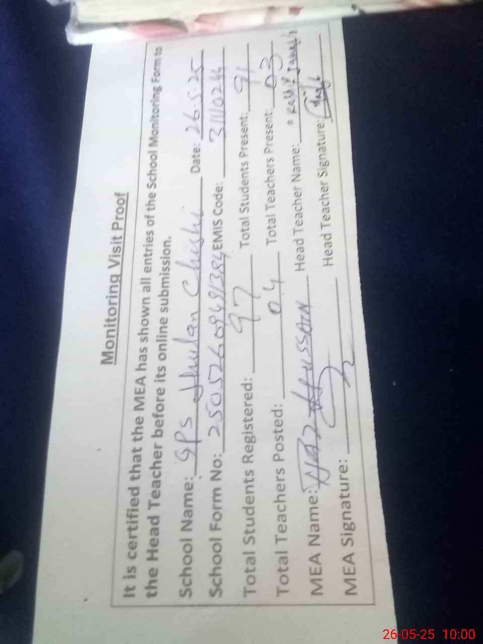 | Attendance Register | Head Teacher | MEA with School | Visit Proof |