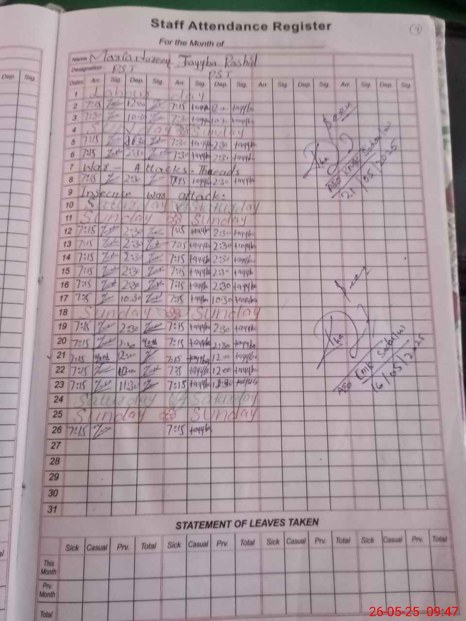 Leave Type | Remarks for Today (Leave,Training, Exam,Absent,Late, Other Duty) |
