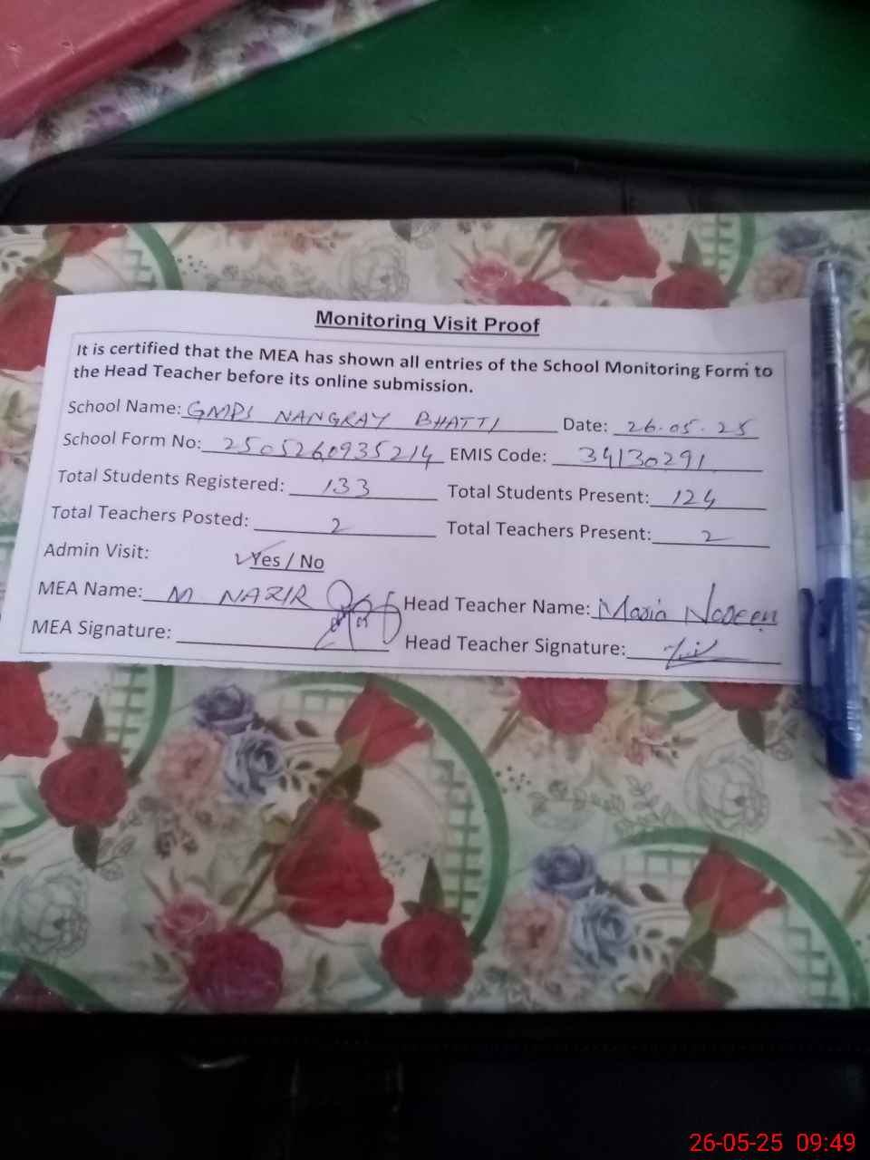 | Attendance Register | Head Teacher | MEA with School | Visit Proof |