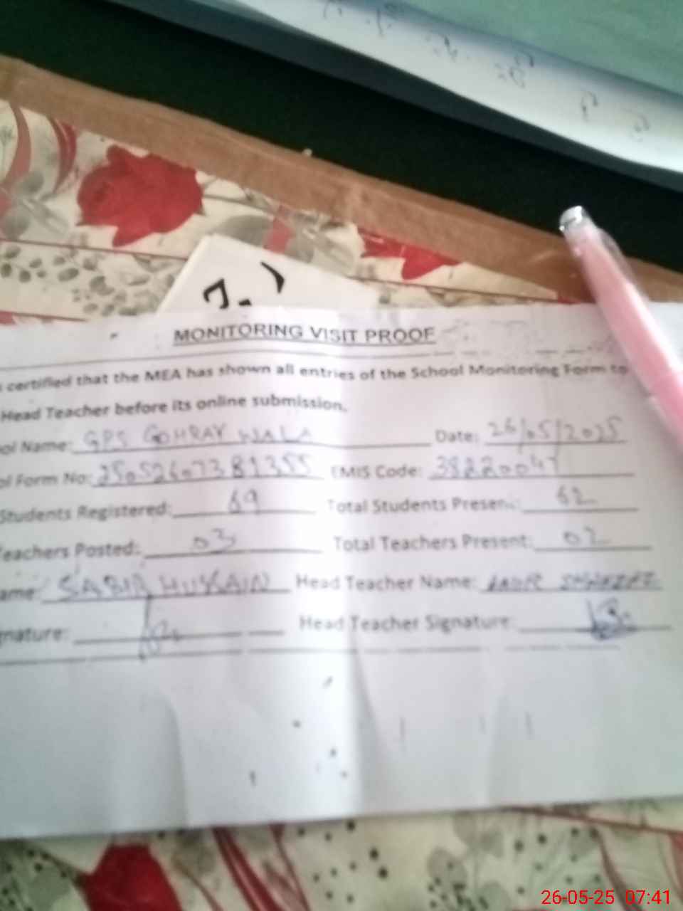 | EMIS Code: 38220047 | Name of School: GPS GOHRAY WALA | |||