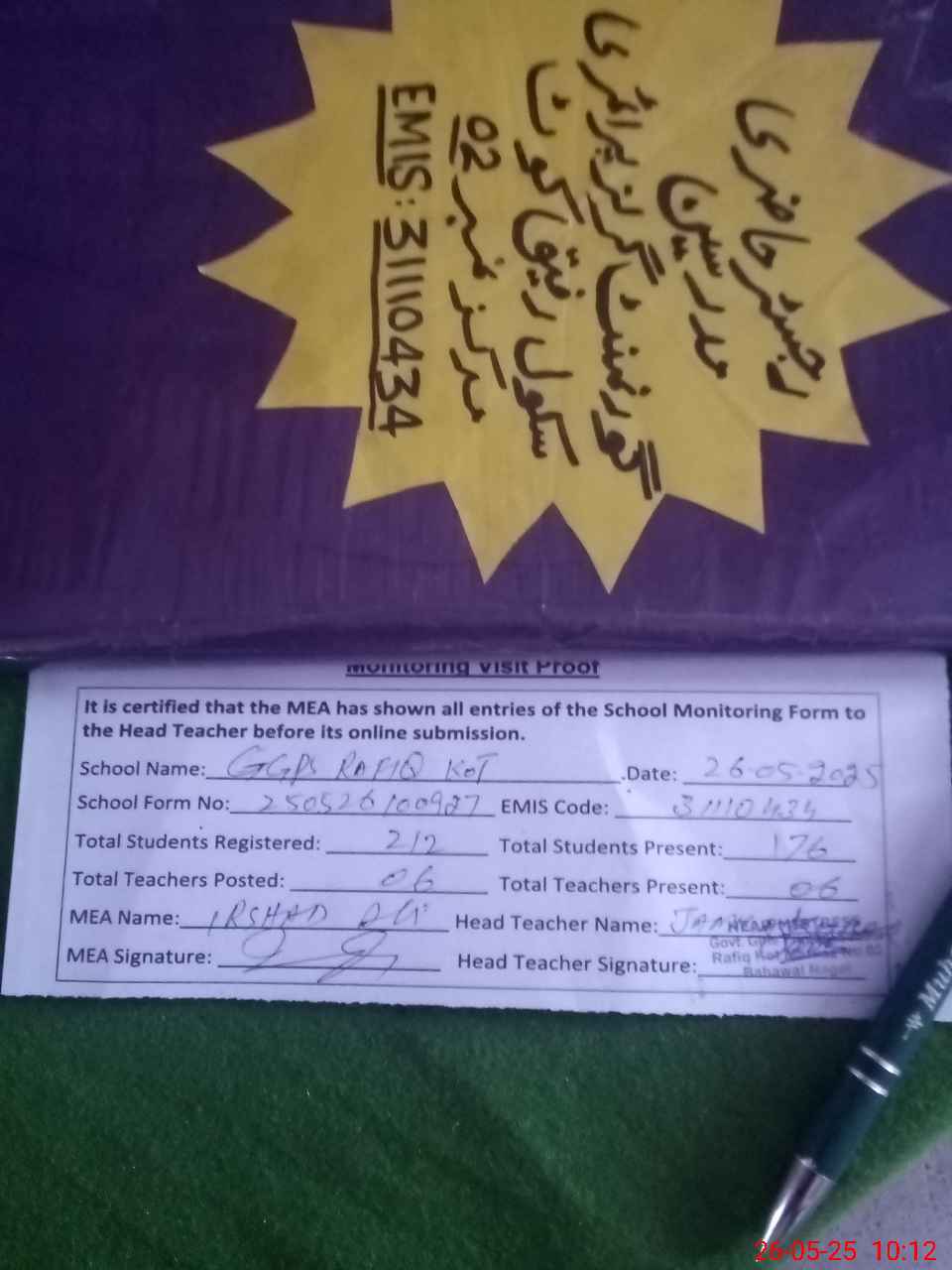 | Certified that this School was Inspected by the Undersigned MEA/DMO Today and the Information Stated Above is as Per Record. | |||||