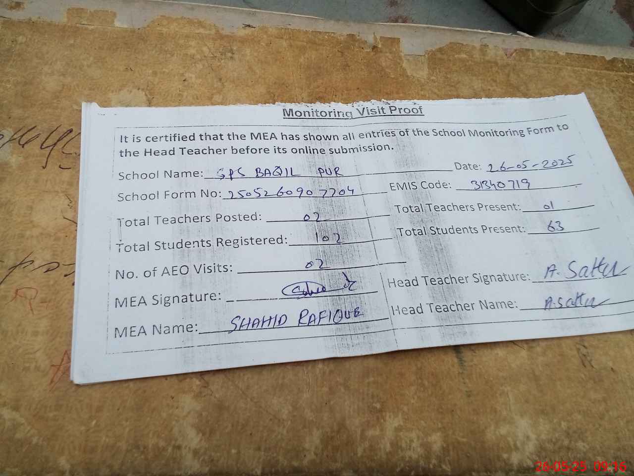 | Attendance Register | Head Teacher | MEA with School | Visit Proof |