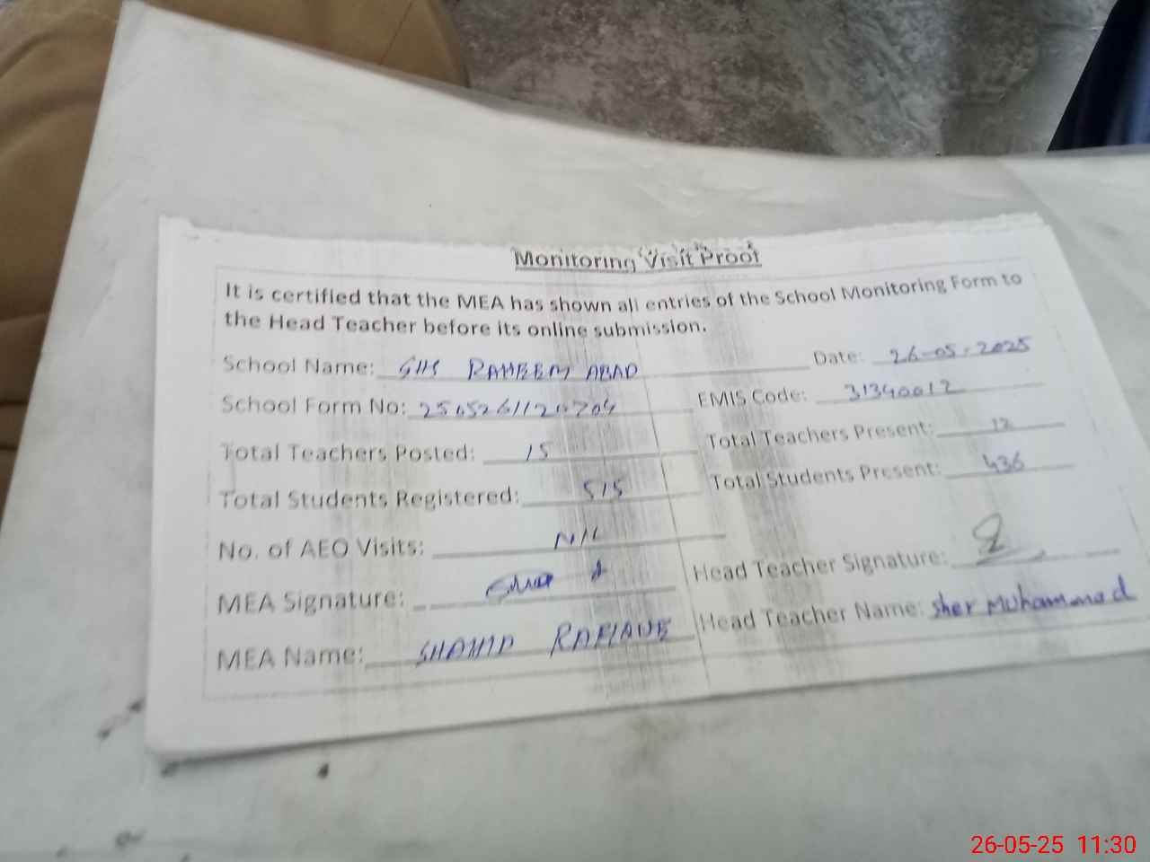 | Attendance Register | Head Teacher | MEA with School | Visit Proof |