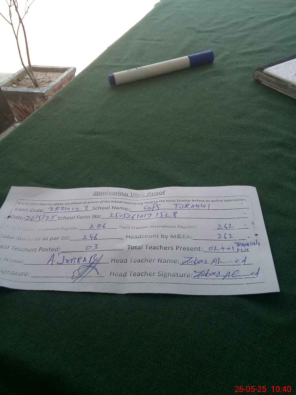 | Attendance Register | Head Teacher | MEA with School | Visit Proof |