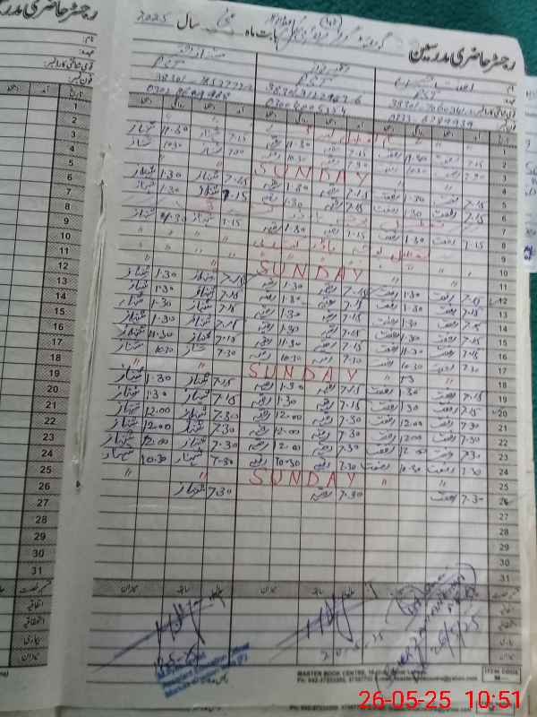 | CNIC | Full Name | Designation | R/C | Absence During Last Calender Month |