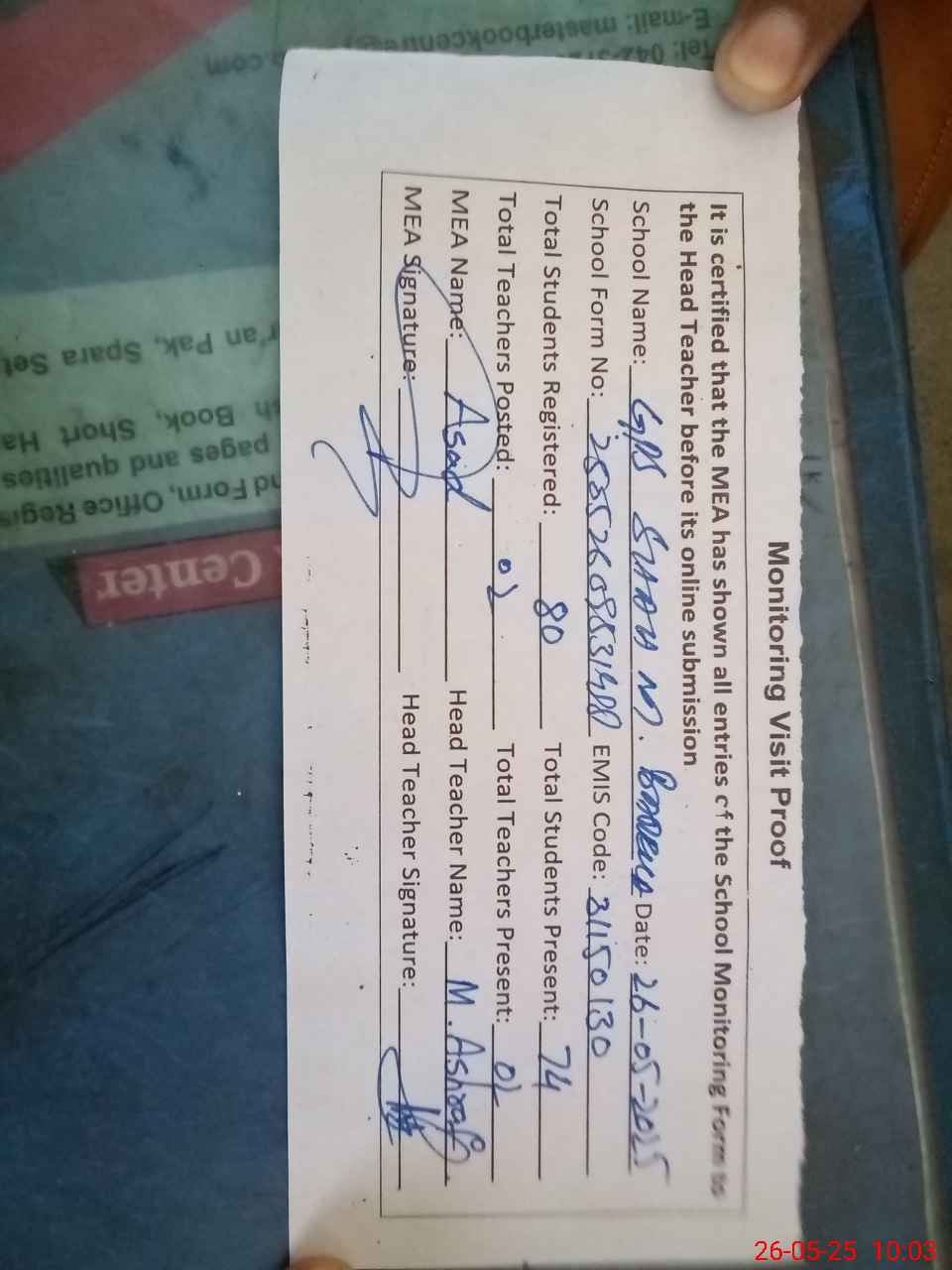 | Attendance Register | Head Teacher | MEA with School | Visit Proof |