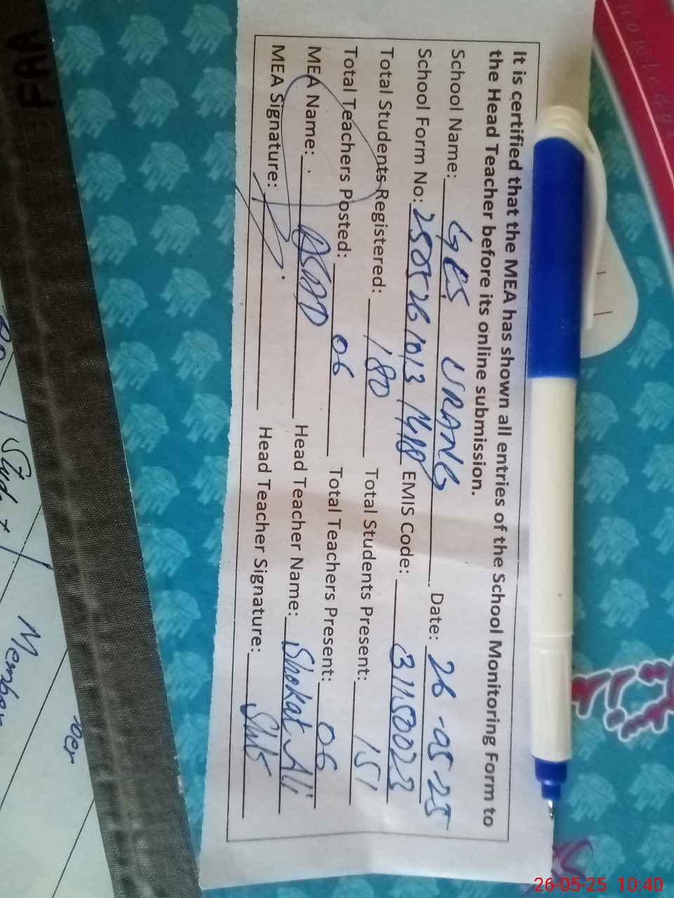 | Attendance Register | Head Teacher | MEA with School | Visit Proof |