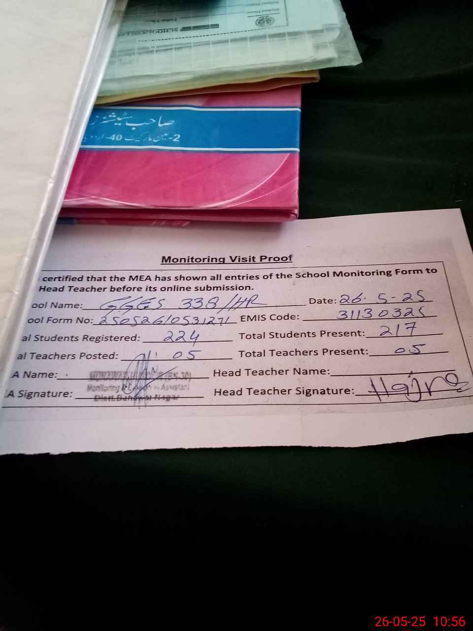| Attendance Register | Head Teacher | MEA with School | Visit Proof |