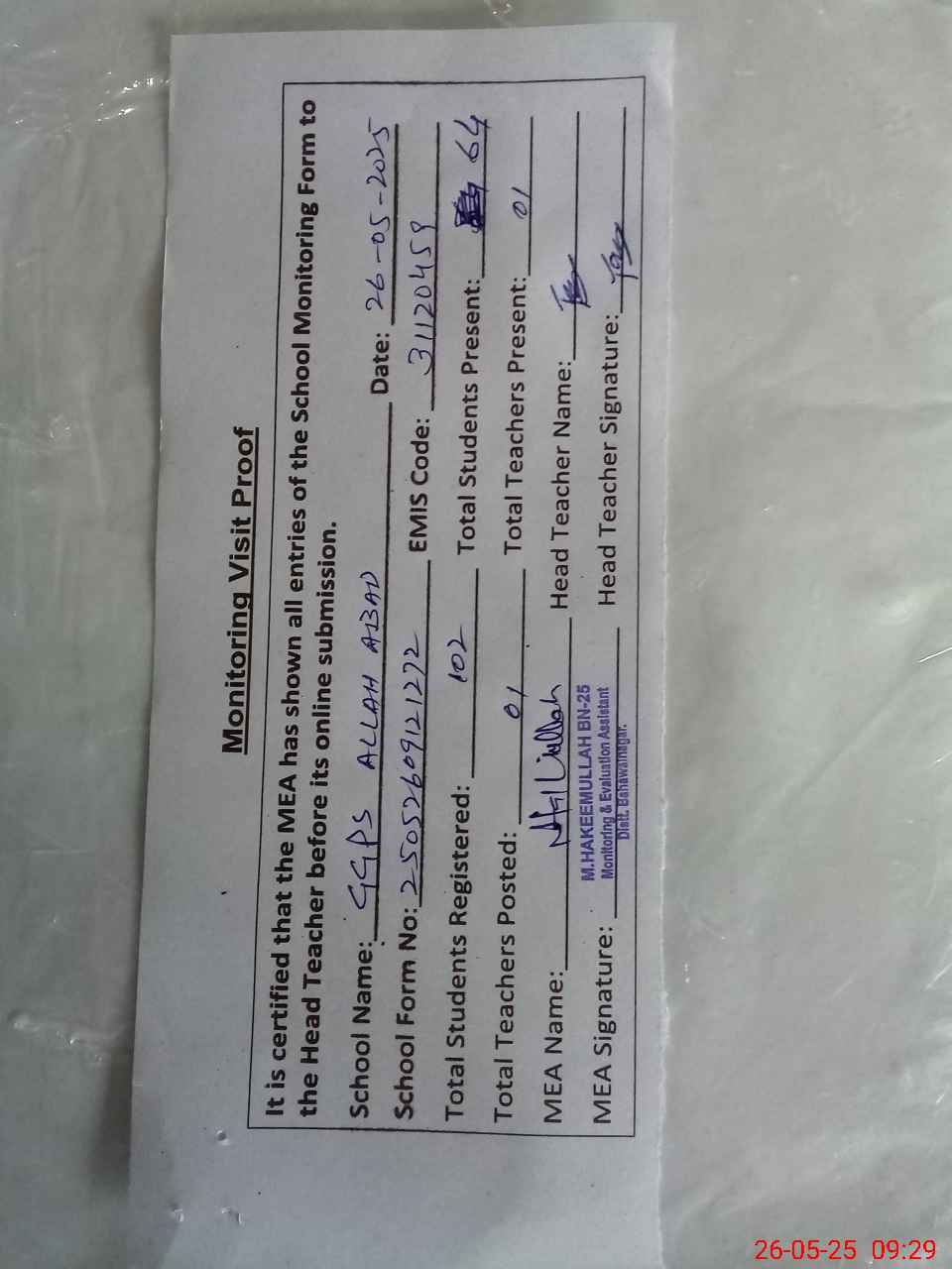| Attendance Register | Head Teacher | MEA with School | Visit Proof |