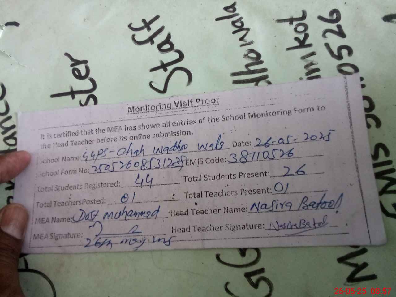 | Attendance Register | Head Teacher | MEA with School | Visit Proof |