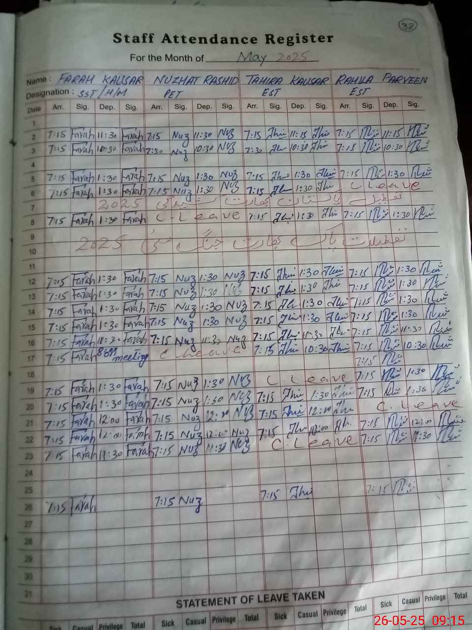 Leave Type | Remarks for Today (Leave,Training, Exam,Absent,Late, Other Duty) |