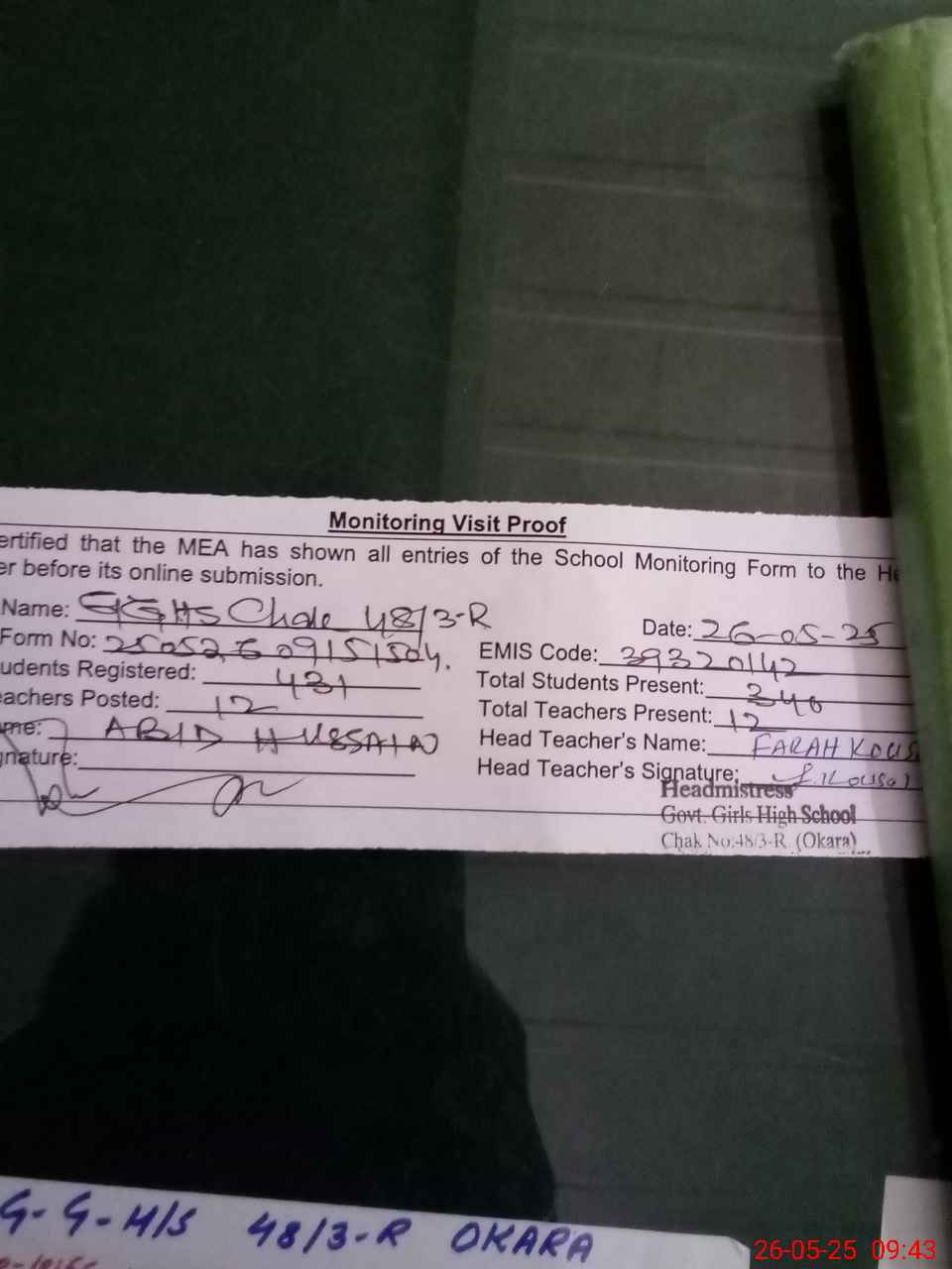 | Attendance Register | Head Teacher | MEA with School | Visit Proof |