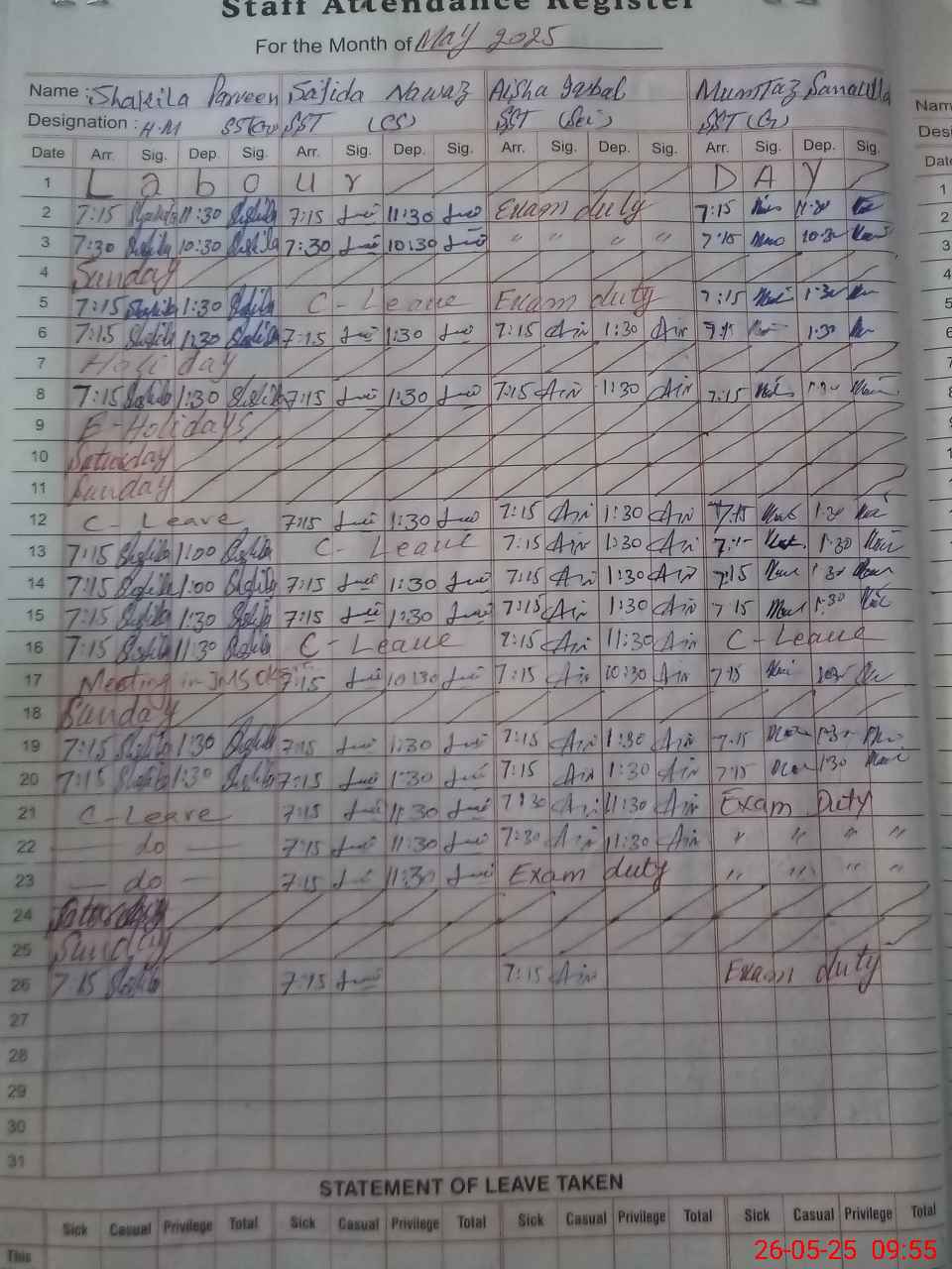 | 35**** | Mu**** Sa**** | 5 | 1 | 0 | 0 | 0 | 0 | 0 | 0 | 0 | 0 | 0 | Exam Duty |