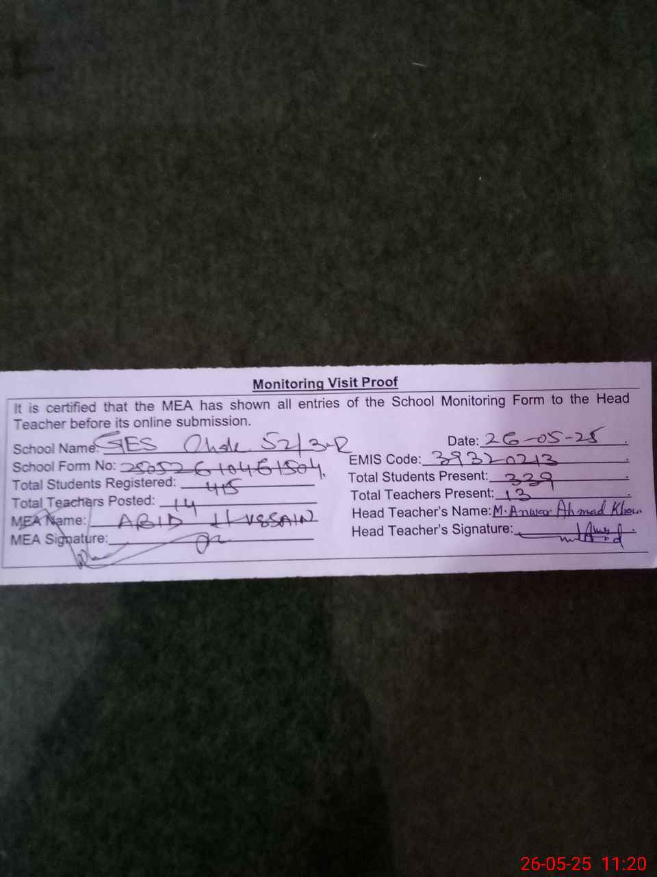 | Certified that this School was Inspected by the Undersigned MEA/DMO Today and the Information Stated Above is as Per Record. | |||||