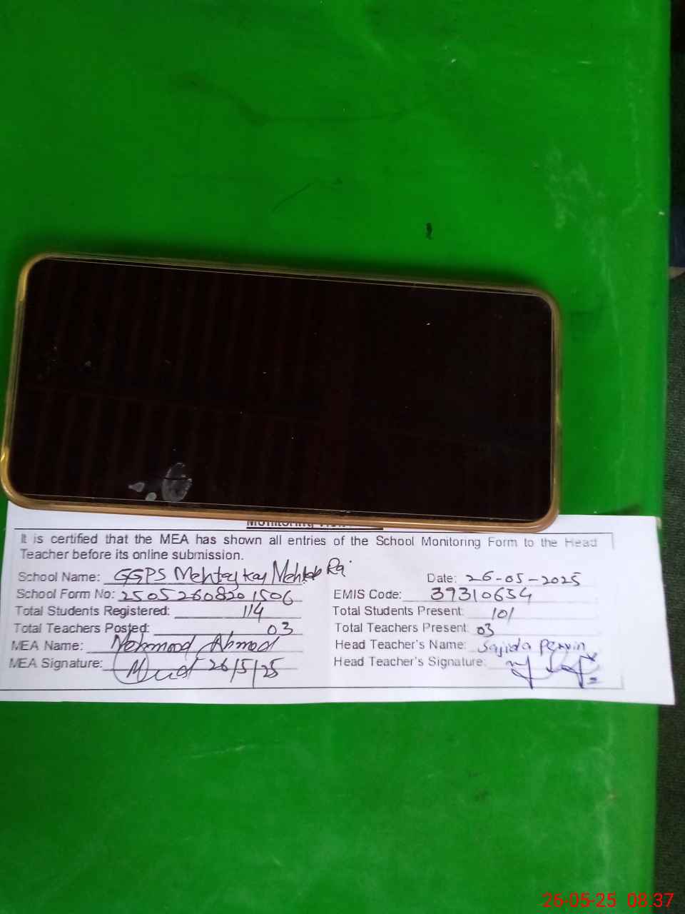| Attendance Register | Head Teacher | MEA with School | Visit Proof |
