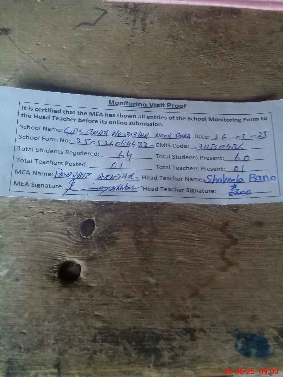 | Attendance Register | Head Teacher | MEA with School | Visit Proof |