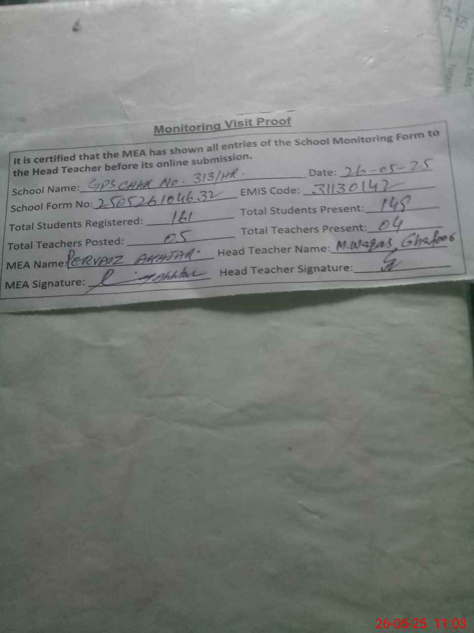 | Attendance Register | Head Teacher | MEA with School | Visit Proof |
