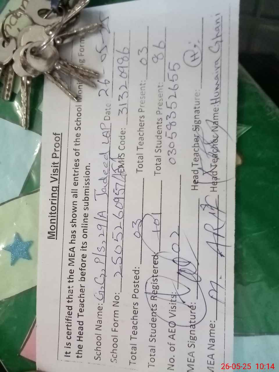 | Name: HU**** GH**** Designation: (School Headmaster's/Headmistress's) PST Phone/Cell Number: 03**** |