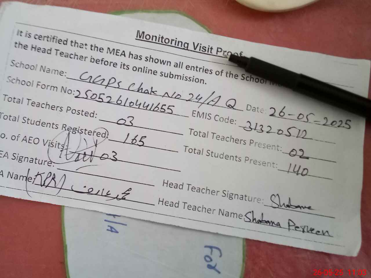 | Attendance Register | Head Teacher | MEA with School | Visit Proof |