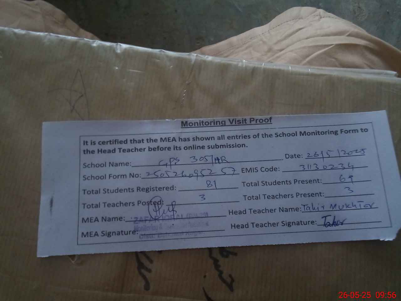 | Attendance Register | Head Teacher | MEA with School | Visit Proof |
