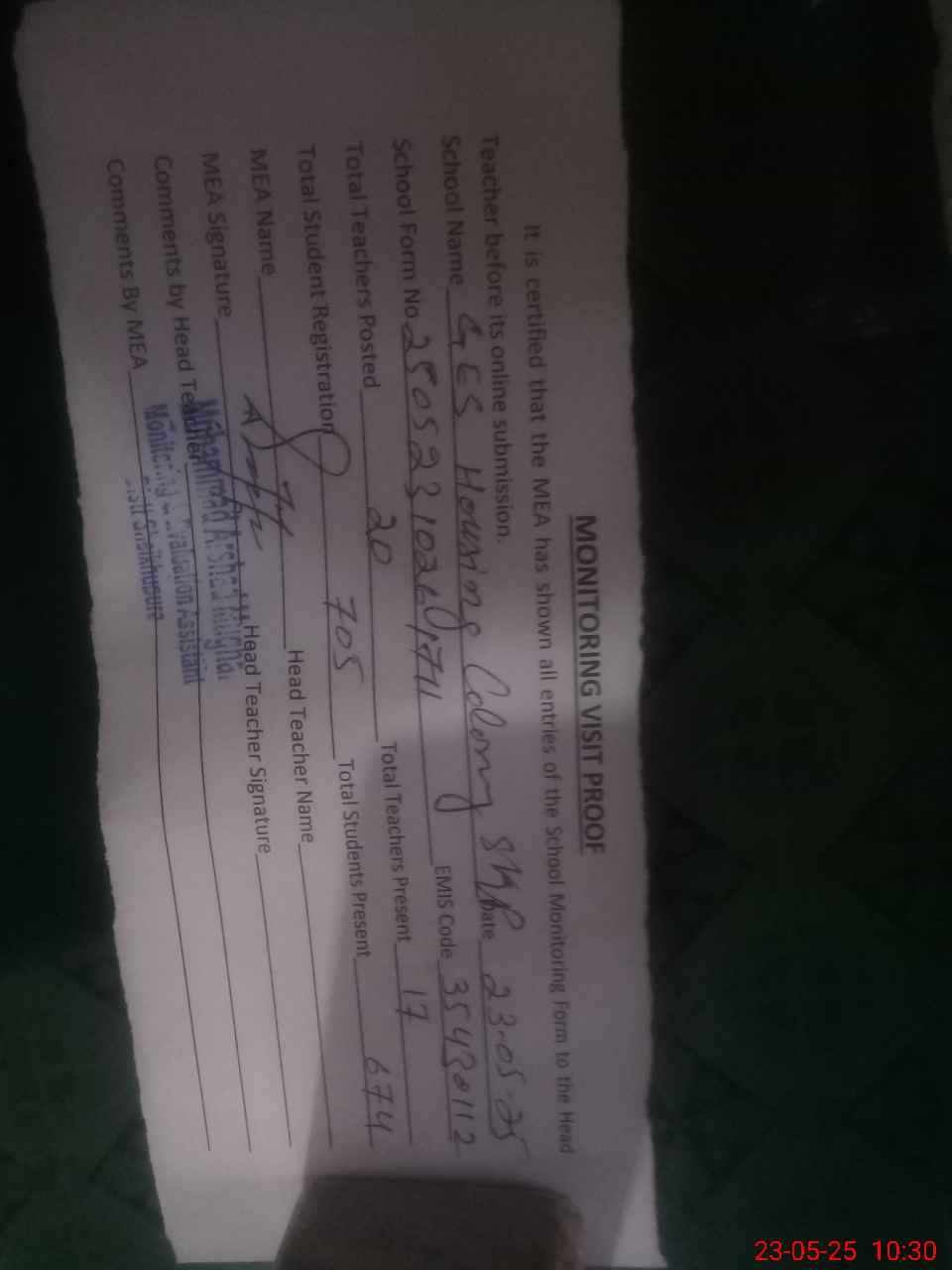 | Attendance Register | Head Teacher | MEA with School | Visit Proof |