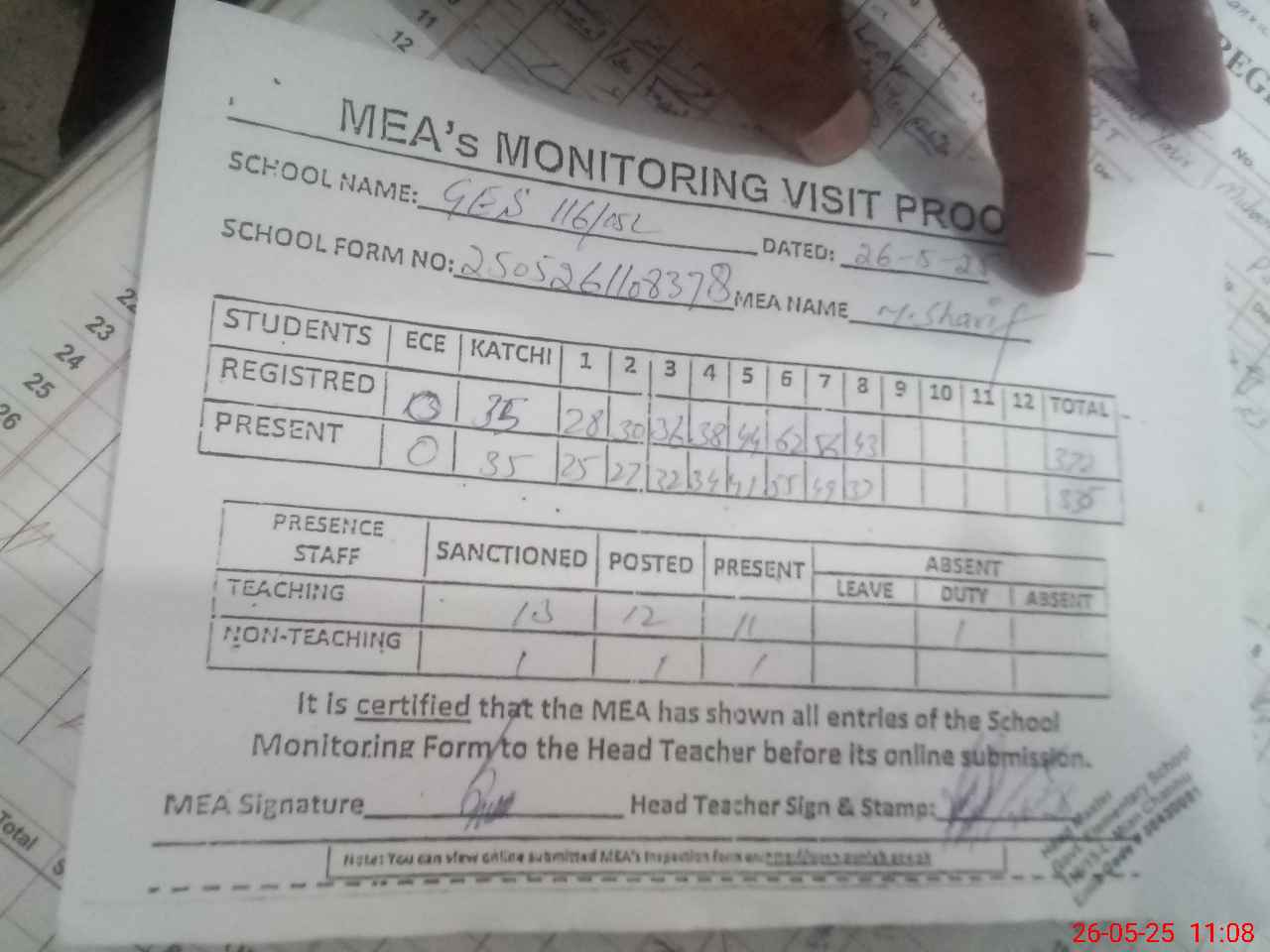 | Attendance Register | Head Teacher | MEA with School | Visit Proof |