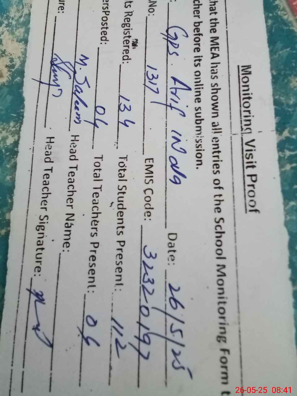 | Attendance Register | Head Teacher | MEA with School | Visit Proof |