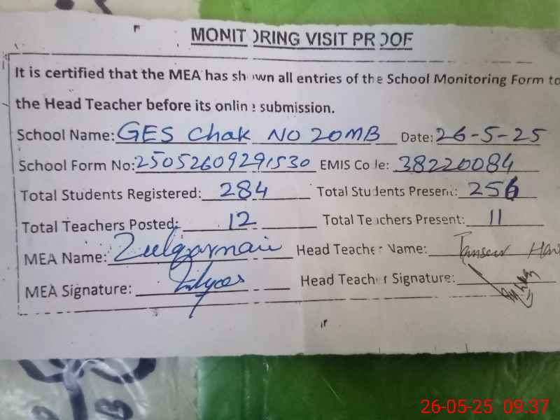 | EMIS Code: 38220084 | Name of School: GES CHAK NO. 20/MB | |||