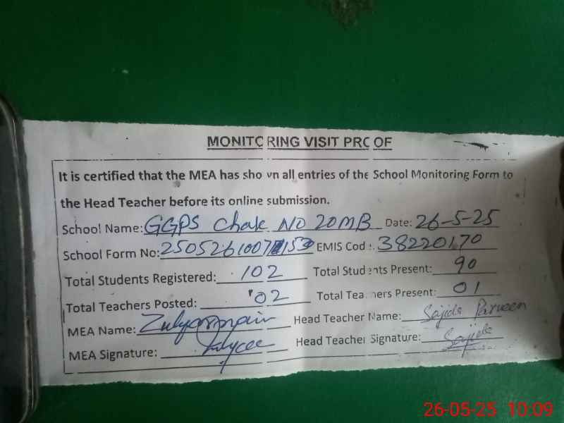 | EMIS Code: 38220170 | Name of School: GGPS CHAK NO 20 MB | |||