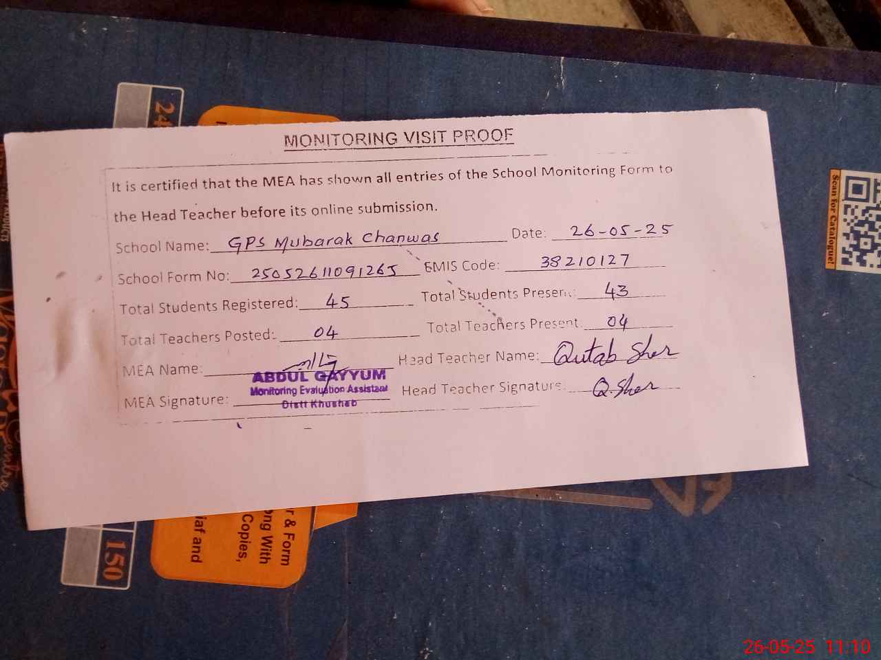 | EMIS Code: 38210127 | Name of School: GPS MUBARAK CHANWAS | |||