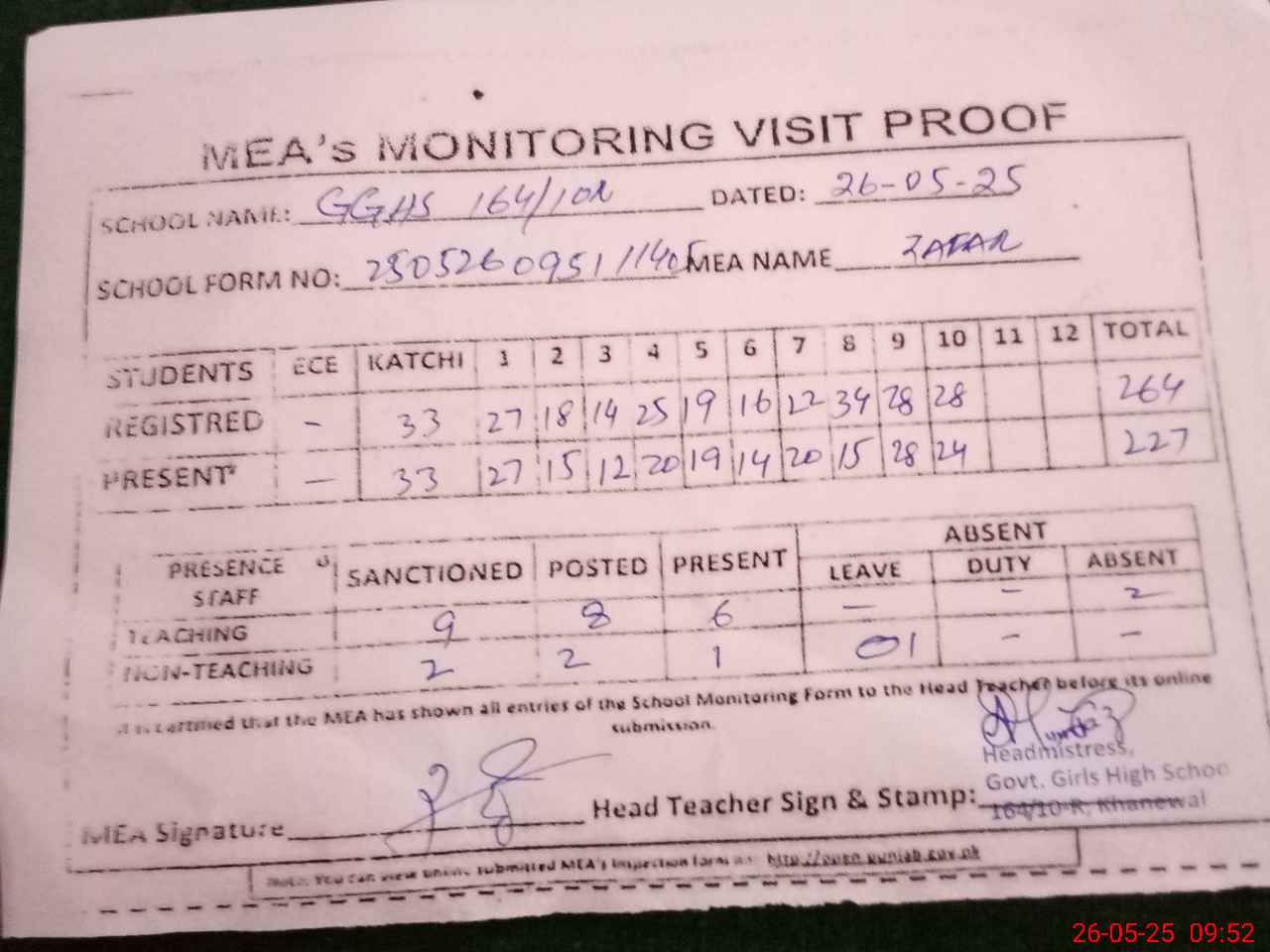 | EMIS Code: 36420102 | Name of School: GGHS 164/10-R, KHANEWAL | |||