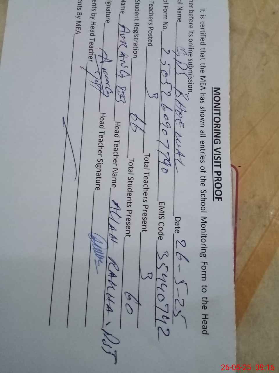 | Attendance Register | Head Teacher | MEA with School | Visit Proof |