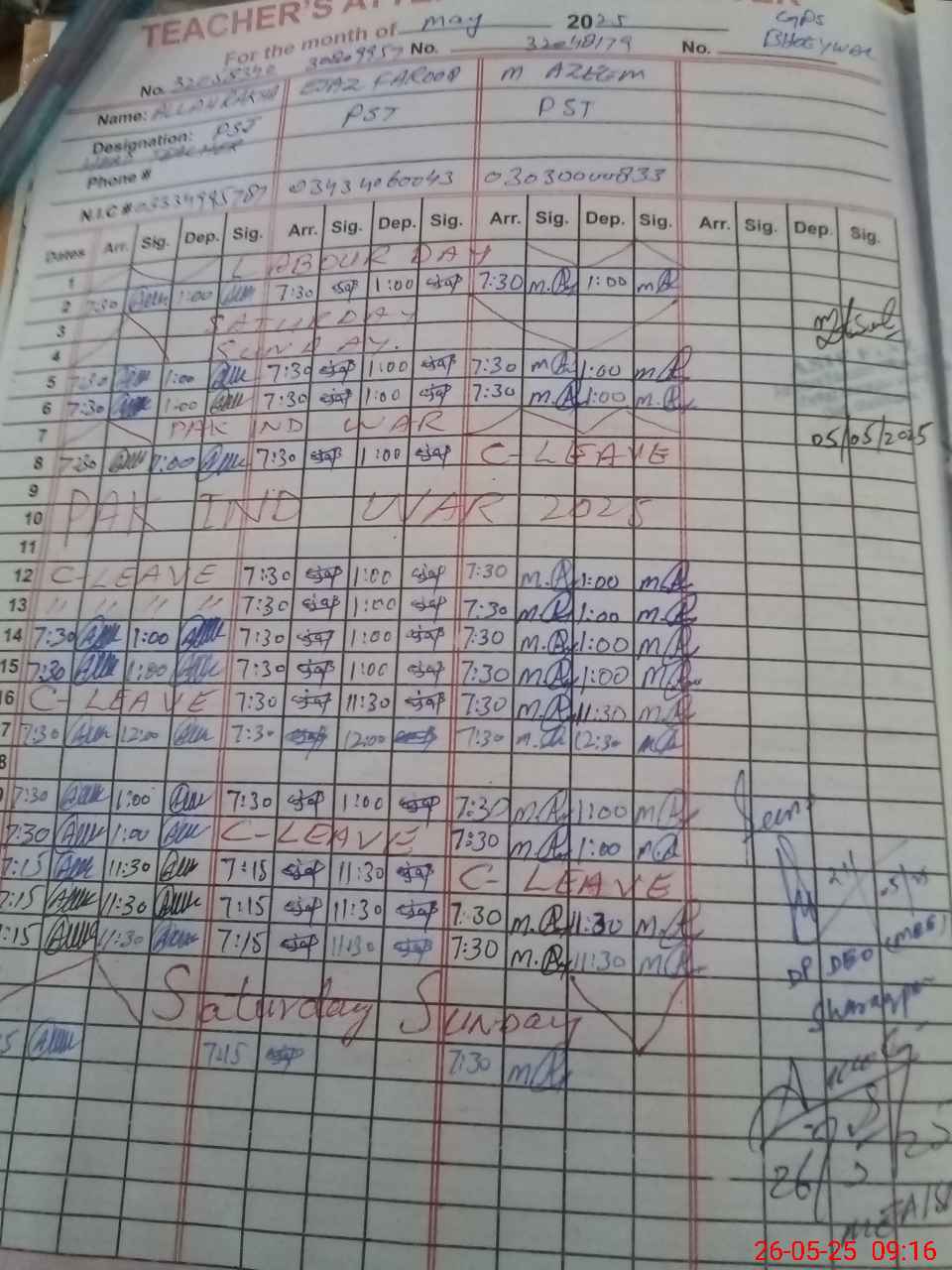 | CNIC | Full Name | Designation | R/C | Absence during last cal. month |