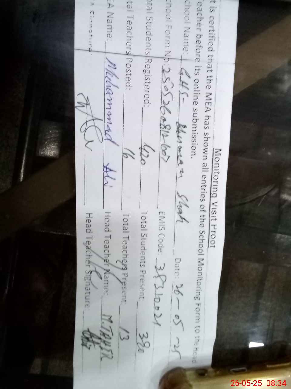 | Attendance Register | Head Teacher | MEA with School | Visit Proof |