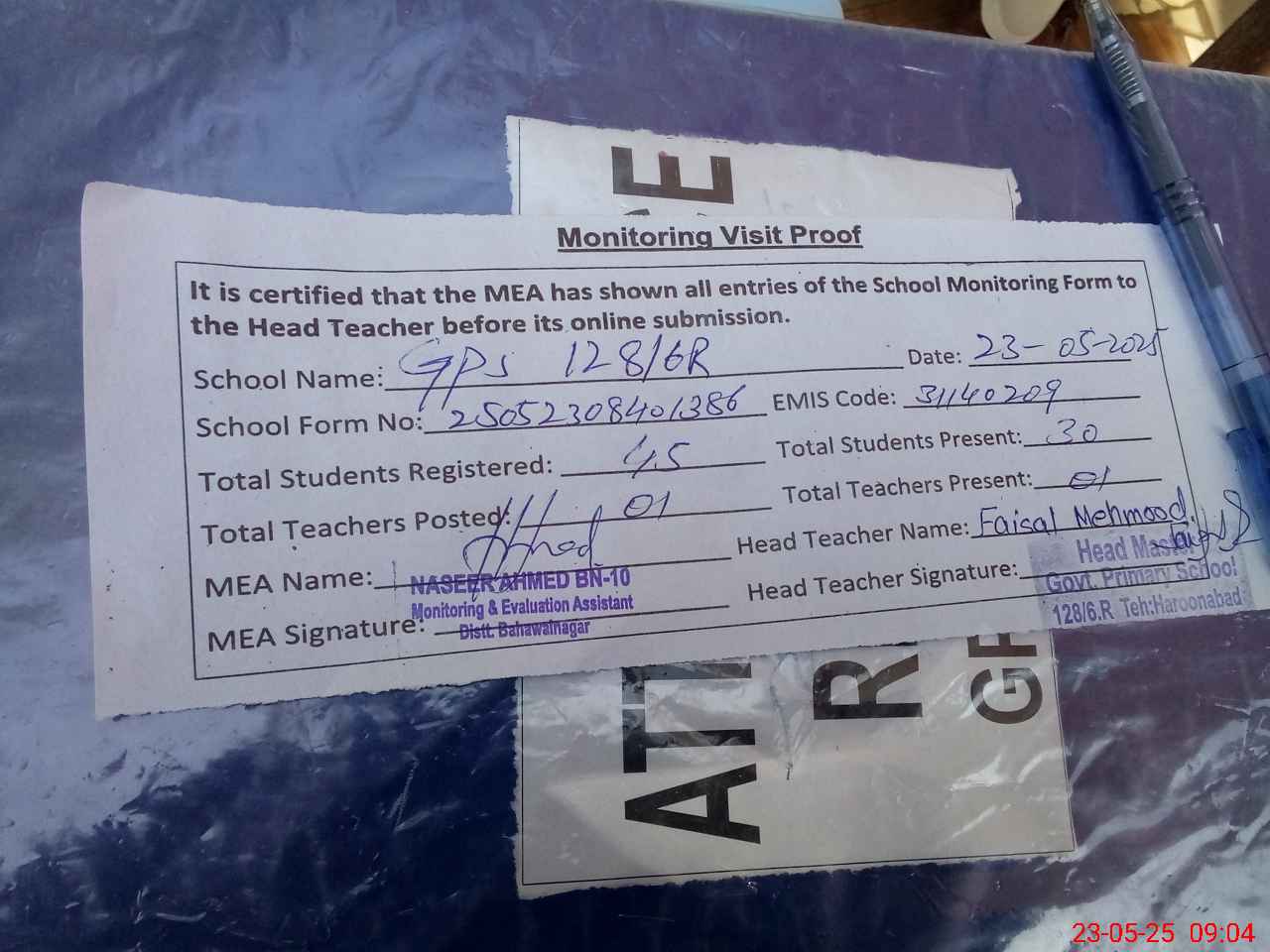 | Attendance Register | Head Teacher | MEA with School | Visit Proof |