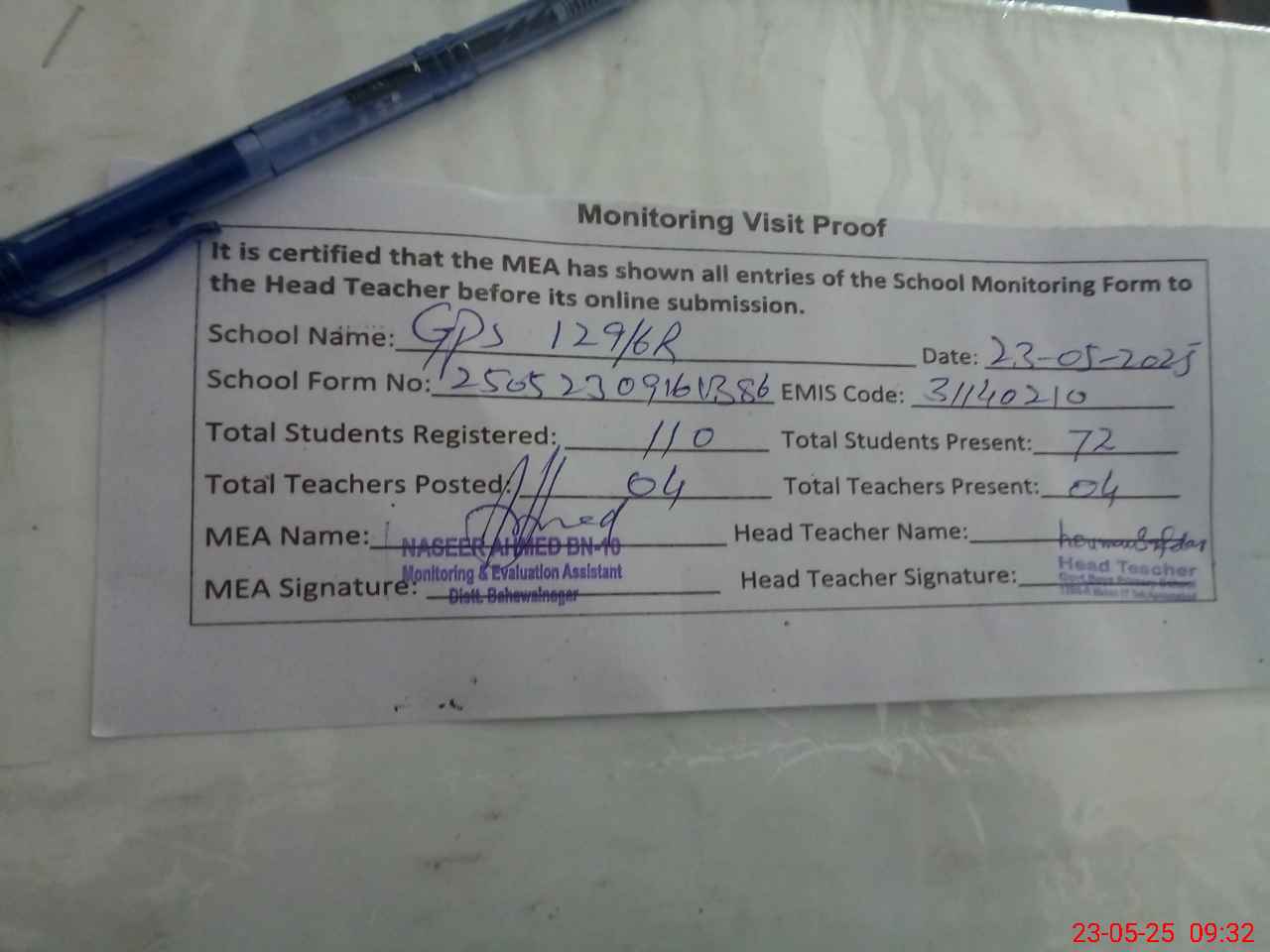 | EMIS Code: 31140210 | Name of School: GPS CHAK NO 129/6-R | |||