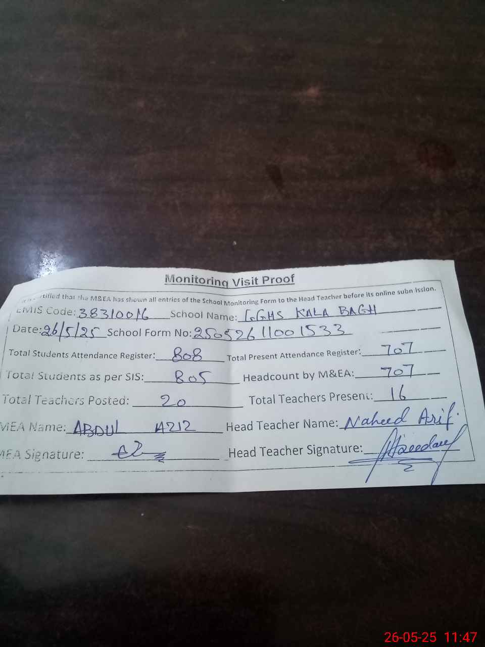 | Attendance Register | Head Teacher | MEA with School | Visit Proof |