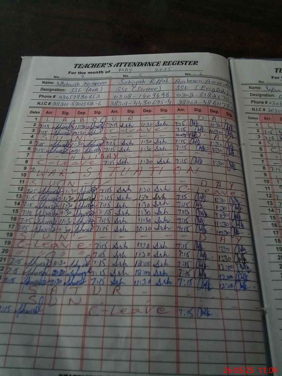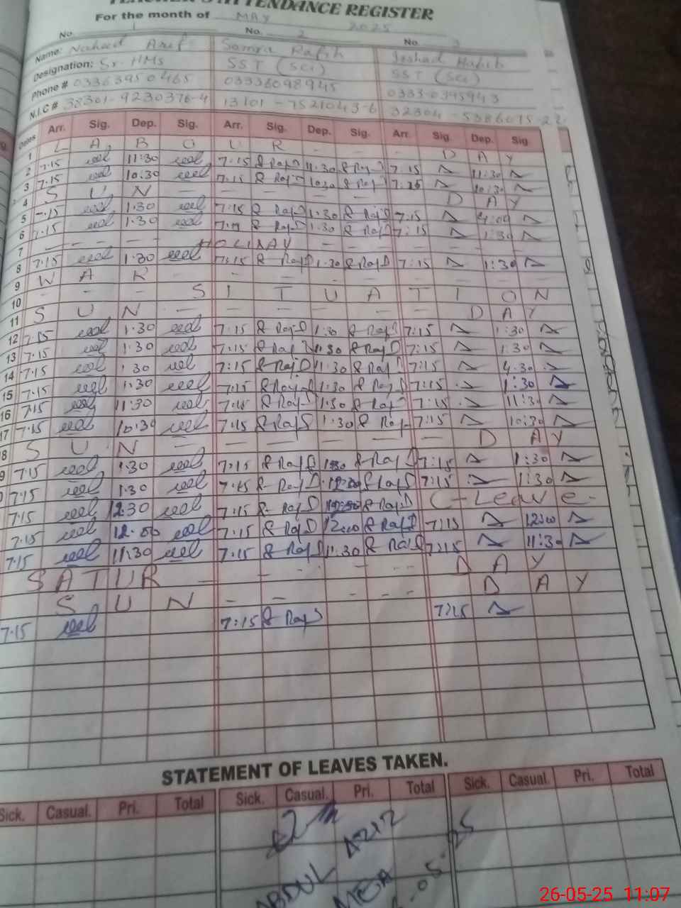 | CNIC | Full Name | Designation | R/C | Absence during last cal. month |