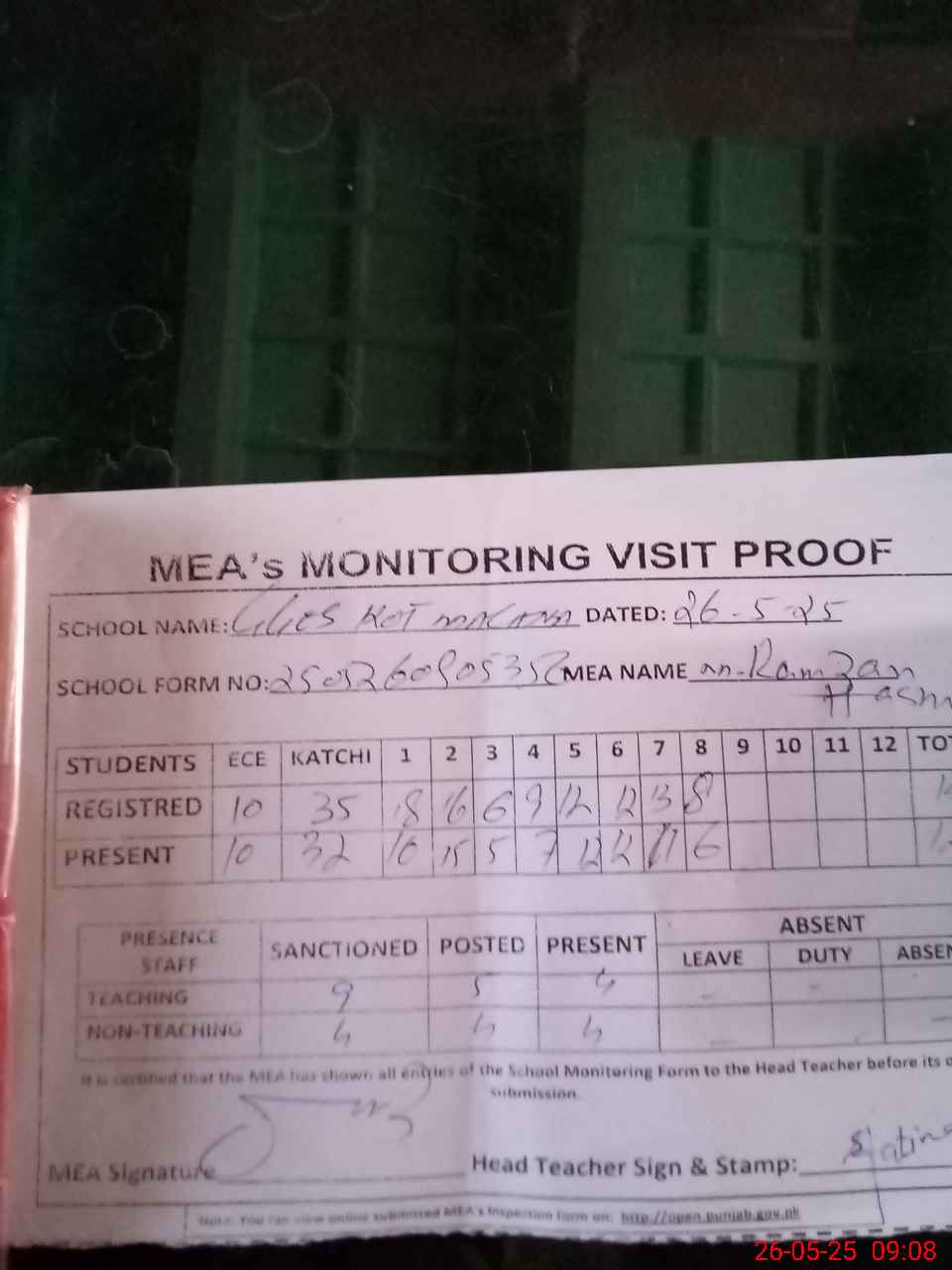 | Attendance Register | Head Teacher | MEA with School | Visit Proof |