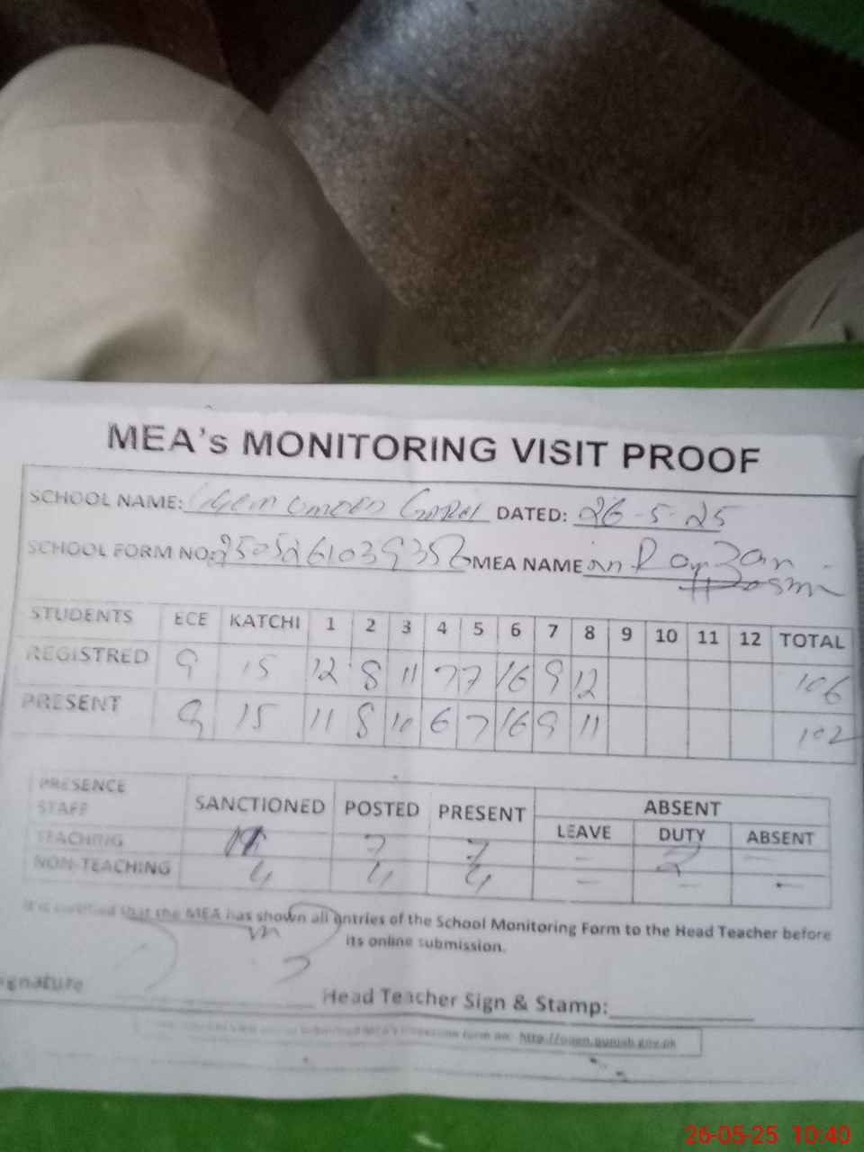 | Attendance Register | Head Teacher | MEA with School | Visit Proof |