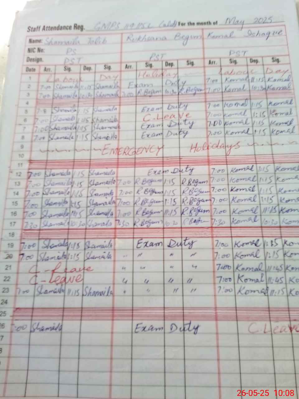 | 36**** | Ru**** Be**** | 1 | 1 | 0 | 0 | 0 | 0 | 0 | 0 | 0 | 0 | 0 | Exam Duty |