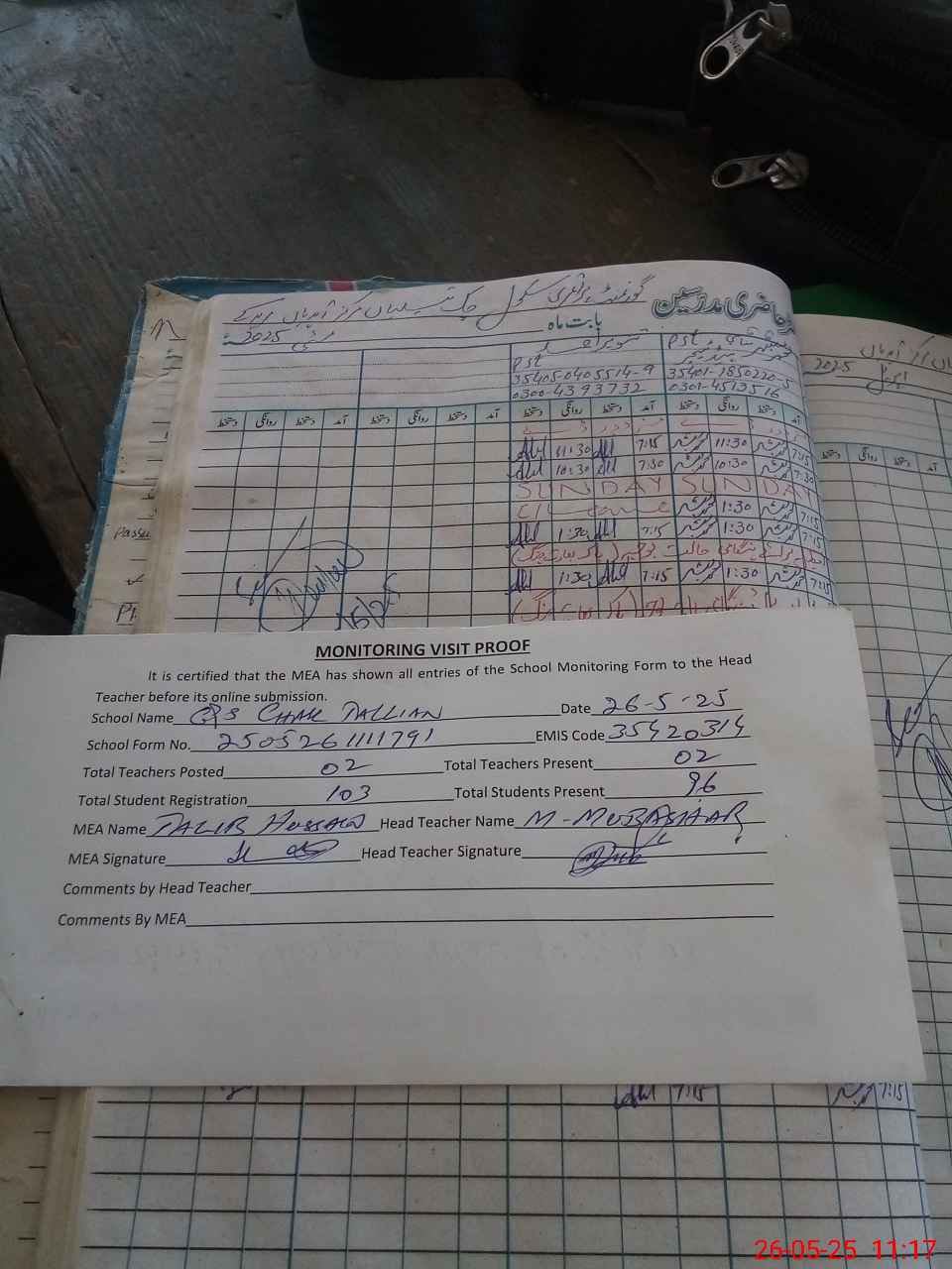| Attendance Register | Head Teacher | MEA with School | Visit Proof |
