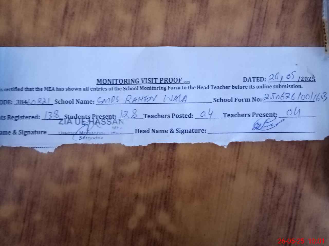 | Monitoring Date: 26-05-2025 | Start Time: 26-05-2025 09:35 AM | End Time: 26-05-2025 10:02 AM | Name of MEA: ZI**** ULHA**** | |
