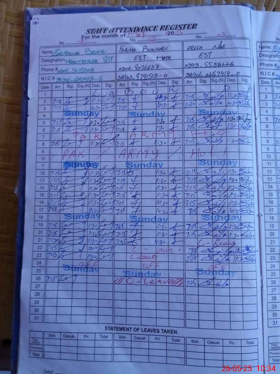 | CNIC | Full Name | Designation | R/C | Absence During Last Calender Month |