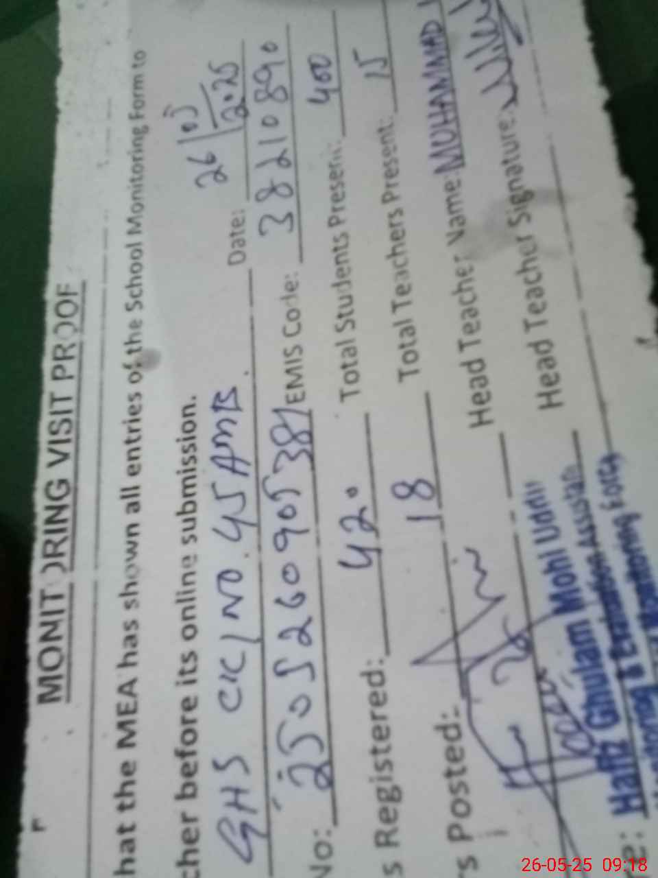 | Attendance Register | Head Teacher | MEA with School | Visit Proof |