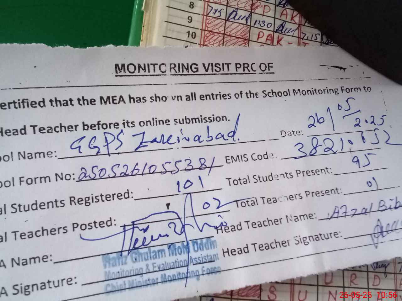 | Attendance Register | Head Teacher | MEA with School | Visit Proof |