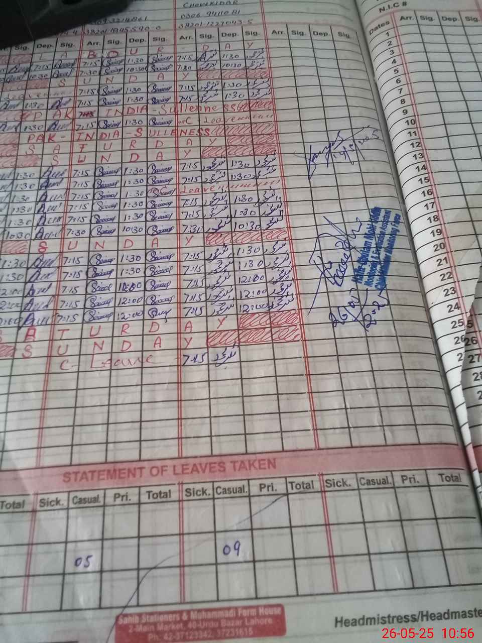 | CNIC | Full Name | Designation | R/C | Absence During Last Calender Month |