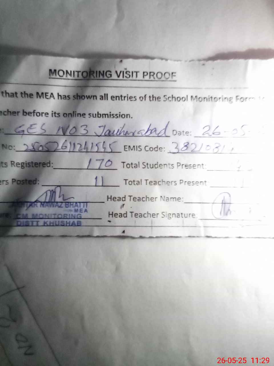 | EMIS Code: 38210814 | Name of School: GES NO. 3 JAUHARABAD | |||
